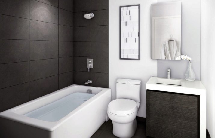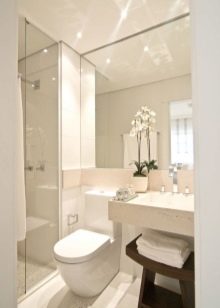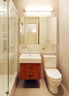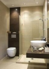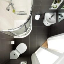 The style of reasonable modern minimalism is considered one of the best for small rooms. The bottom line is to place in the bathroom only the most necessary, necessary. All this should have simple shapes and small sizes. There is no room in the style of frames, vignettes or large mirrors. For showiness, you can divide the room into two halves, each with its own color of the floor covering.