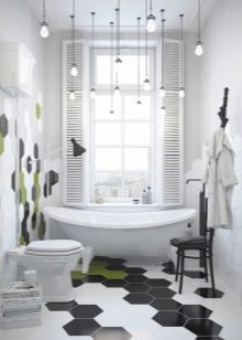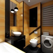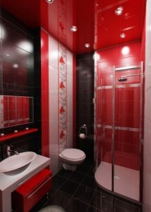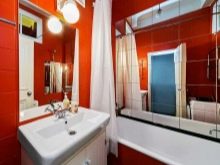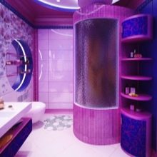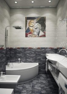 This style is optimal for owners of small, elongated rooms. A narrow room can be divided into two parts. One of them will include a shower cabin and run it in a dark color - black, red, blue. The second is a bright zone, in it you can place a sink. You can complement the design by placing a photopanel at the junction - by putting, for example, Malevich's “Black Square” or a photocopy of Harlequin’s portrait.