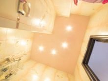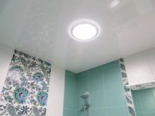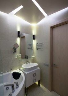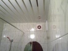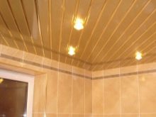 The ceiling can be finished with plastic panels. It looks equally good with tiles and with panels on the walls. But it should be noted that the ceiling of a small bathroom should always be bright. This will help visually "raise" the height of the room. It is advisable to choose monophonic light materials for the ceiling, which will make a profitable duet with lighting. Drawings on the ceiling are considered acceptable only if they are a logical continuation of the decorative wall decoration.