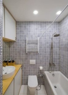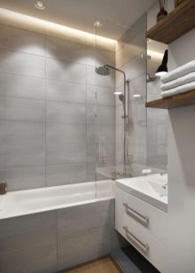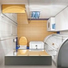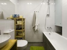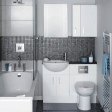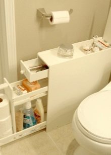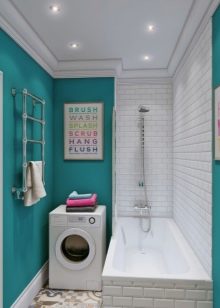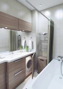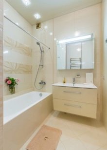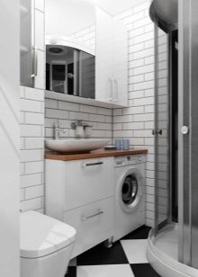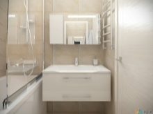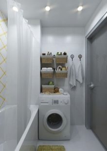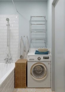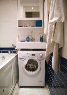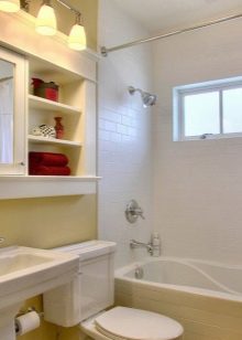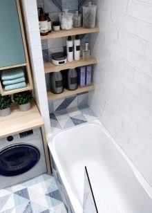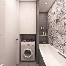A cupboard with a door is placed above the bathroom; shampoos, washcloths and other accessories can be placed in it. Another storage for things can be placed under the bathroom - there is usually enough space there. In the corner under the sink you can put a washing machine with a vertical load of linen. Above the sink you can also hang a cabinet - open type or with doors.