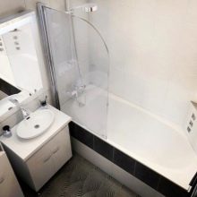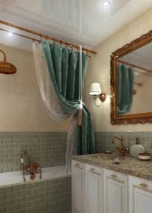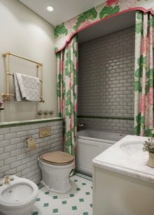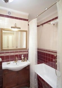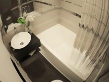 Do not overload the room with a large amount of furniture, one cabinet is enough, certainly with sliding doors. It will support the general style, will serve as a storage place for bathing and washing accessories, and will also perfectly mask the place where the pipes of communications pass. Bright accents are acceptable, but should be small - a bright glass for brushes, a bright hanger. You can make a brighter frame for the mirror. It is better to replace the curtains with sliding bright doors.