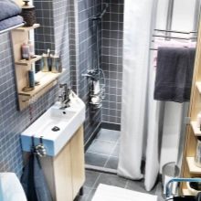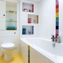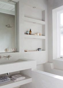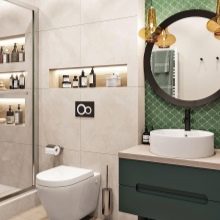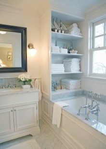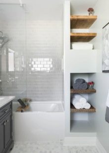 No matter how compact the furniture is, it nevertheless invariably “steals” the space. And therefore, you can almost completely abandon it and use niches. They are made of moisture resistant drywall at the stage of wall decoration. Their number can be any, everything is up to you. Niches win you space, but storing things in them has its own characteristics. So, you will have to provide everything for proper ventilation, otherwise towels, bathrobes and other necessary things will quickly become moldy and will smell unpleasant.
