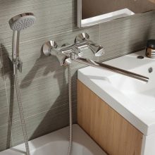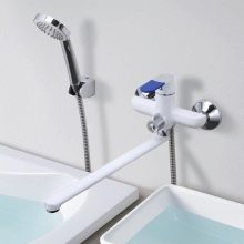 The small tricks include a single faucet for the sink and bath. The idea is not new, but very promising. Such mixers fit perfectly into the decor and allow you to win extra space. A faucet with a long gander can turn both towards the bathtub and the sink, but in this case the sink will have to be placed as close to the corner of the bathtub as possible.