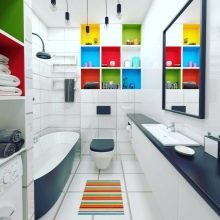 Non-standard solutions are numerous. You can make a roomy shelf or a niche with shelves above the entrance to the bathroom. True, only adults can use it; children will not have enough growth. On the other hand, it is very good if you store household chemicals, washing powder, bleaches and cleaning products on such a shelf, which are not a toy for children. If the repair budget allows, you can make ergonomic sliding shelves, cabinets, a sliding mirror.
