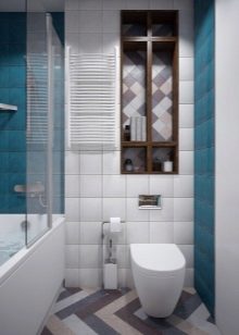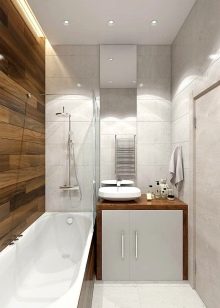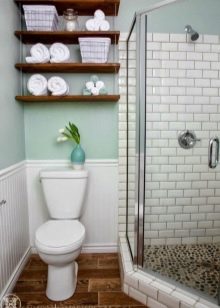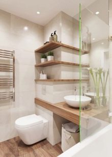 Therefore, it’s worth considering about color accents, spots. It can be bright individual tiles in the lining or bright shelves. If the goal is to make a place of relaxation and rest after work from a tiny room, then it is worth considering the option of combining light materials and furniture with elements that imitate "wooden shades." This idea is especially good for a general white, beige or gray background.