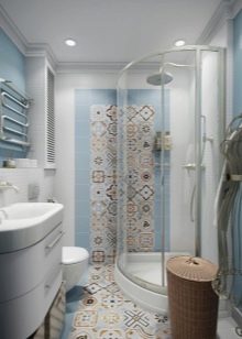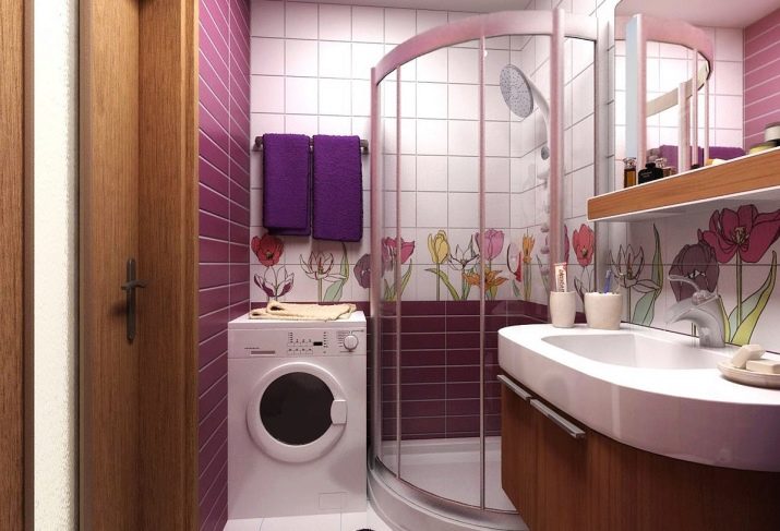 In this embodiment, the area of the room was a little larger, but space savings were managed to create both visually and actually. The design turned out to be bright due to the combination of two primary colors and a moderate and stylish floral print laid out in the middle line with tiles. The bathtub has been replaced with a cabin with transparent sliding doors. Matte would disrupt the overall floral ensemble. There was a separate place for the washing machine, but all the shelves for storing things had to be placed in the space under the sink