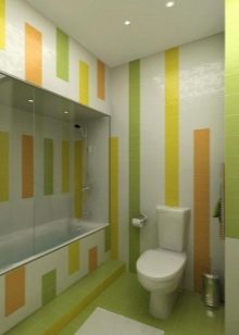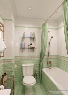 - And here is an unexpected decision called Avocado. You must admit that there are a lot of similarities - a delicate green color, an abundance of mirrors that create a perspective due to the location opposite. In this case, the bathtub is small, angular, acrylic. Towel racks are located under the sink. A visual increase in the ceiling was achieved due to the vertical laying of tiles on one wall, as well as a visual expansion of the room due to a horizontal pattern with the same tile on a perpendicular wall.