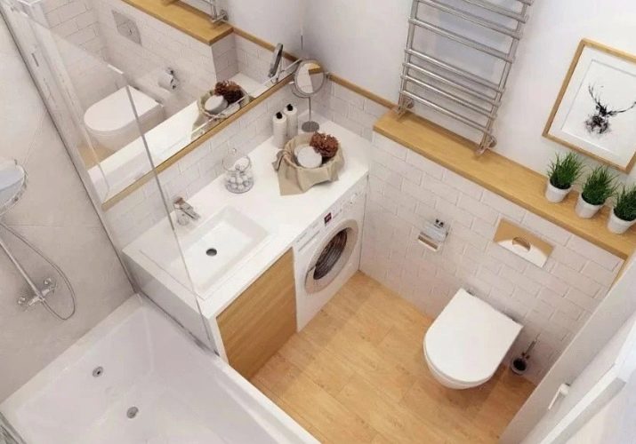 See how gracefully they solved the issue of space in this bathroom, whose area is only 3.5 square meters. All necessary fit into it and the central space remained free. Light shades of materials, the location of the heated towel rail opposite the bathtub, the combination of the sink and the washing machine made it possible to achieve an impressive effect. The toilet flush tank was located in a niche inside the wall, and under the sink there was a place for compact but roomy shelves.