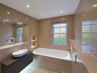 To make it easier to calculate how many light sources are needed for a large bathroom, should be allocated for every 1.5 square meters. m. by 1 device. Often for a more aesthetic and neat appearance they are installed on the ceiling in a checkerboard pattern.