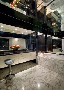 It is worth noting that a mirrored surface can be a good solution in a spacious bathroom with a luxurious finish and perfect order. In a cramped room filled with furniture, household appliances, open shelves with many small items and other details, a reflective ceiling can create a feeling of complete chaos. Also worth mentioning are glare that the ceiling can cast onto walls.