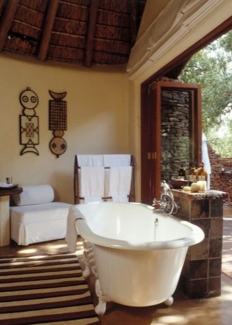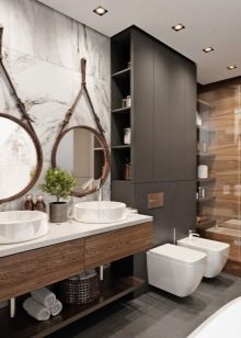 - Modern - the accent on accessories prevails in this style, sizes and shapes may be non-standard. Furniture can be made from cheap but durable materials. Walls under a tree will become an excellent background for a corner bathtub or an unusual sink.