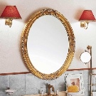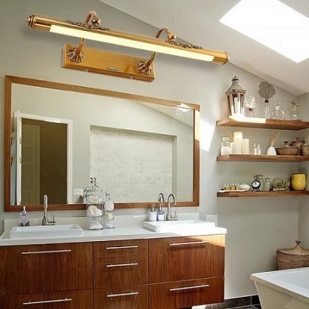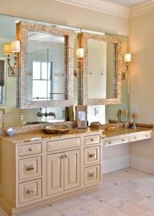 As for the form, it can be a cylindrical lamp in a frame of yellow metal with beautiful carved patterns. You can choose a sconce. There are several options: two single devices, two double (if the mirror is wide) or one lamp with three shades. In the last two options, the light source is located on top.