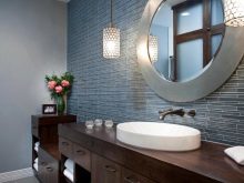 An unusual embodiment of minimalism is a faucet mounted in a mirror without a frame. A sink made in the shape of a circle is "supported" by a sconce of a similar shape. The correct arrangement of devices gives a sufficient amount of light, and the originality of the idea makes the bathroom unique.