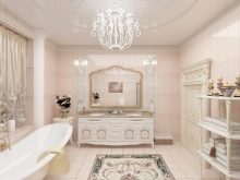 The built-in lighting in the classic interior will look out of place. All decor should match the vintage character of the style.. The mirror in a beautiful metal frame is complemented by an external lighting fixture. Finishing classic interiors usually has warm colors (milky, beige, brown).