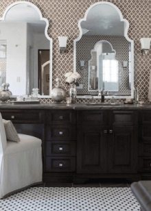 The same goes for plumbing. There are no chrome parts in this style. Metal imitates gold or copper. Respectively, both the mirror frame and the lighting fixtures should have the same shade.