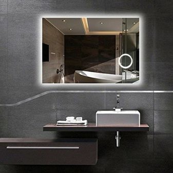 Especially for women are created mirror cloths with magnification. In such models, a small section of the canvas enlarges the image several times, allowing you to do face cleaning, complex makeup and other procedures. Some express the minimalist concept in a different way. A mirror without a frame is mounted on the wall. A lamp in the form of a tube, circle or rectangle in a chrome frame is placed on the sides or top.