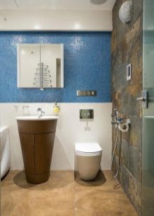 - A bathroom in blue is one of the most common options. Excessive coldness of the combination of white and blue is reduced due to mosaic on the wall and decorative colors on the pedestal. Originally solved the problem with the placement of the washing machine.