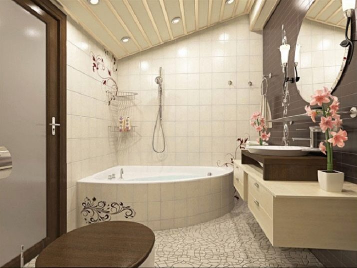 - In this version, a corner bath is used, which looks very modern. The interior is cream brown. The possible rigor of such a combination of colors is minimized thanks to accents on pink flowers and decorative stickers on the bathtub.