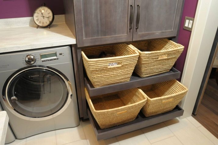 Well and finally when installing the washing machine in the bathroom, it will be possible to store items that require washing in the machine itself or in nearby containers. Often in the bathroom a lot of little things are stored. These are cosmetics, for washing and cleaning, bath and shower. All these things are usually located on all accessible surfaces, littering and "eating" an already small space. To avoid this, it is necessary to clean all small items in special lockers that can be purchased at any home store. Hanging boxes will fit in well, which will not take up much space, but will retain the appearance of free space.