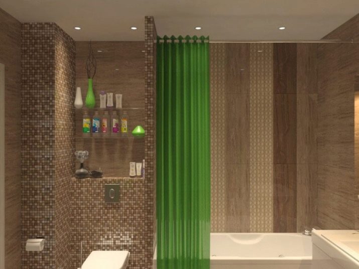 - The interior of this bathroom is made in warm brown tones, but the bathroom does not seem too dark due to the bright green accent on the shower curtain. The niche above the toilet was used favorably - not only the necessary hygiene products, but also decor elements were located on the glass shelves. Wall covering is not continuous and not monophonic. Mosaic with light patches and different shades of panels near the wall near the bathroom create a feeling of spaciousness and freshness.