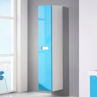 For a room with high humidity, a wall cabinet is an ideal option: it does not touch the floor and can be installed at any height. In small rooms, to save space, a narrow pencil case is placed above the plumbing equipment.