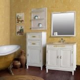 The sizes of the finished bathroom cabinets are different. Floor cabinets most often have a height of 80-100 cm, hanging models - 50 or 60 cm. The width usually corresponds to the width of the cabinet for a sink (from 50 cm). Cases, of course, are narrower. The depth of the cabinets varies from 30 to 45 cm, although there are more compact options (20 cm).