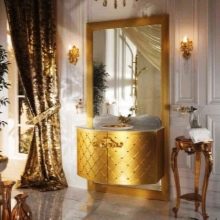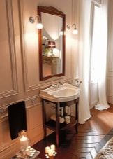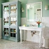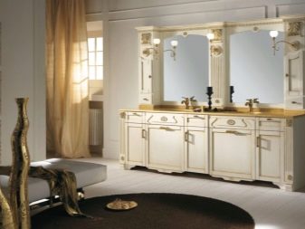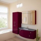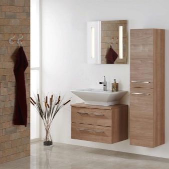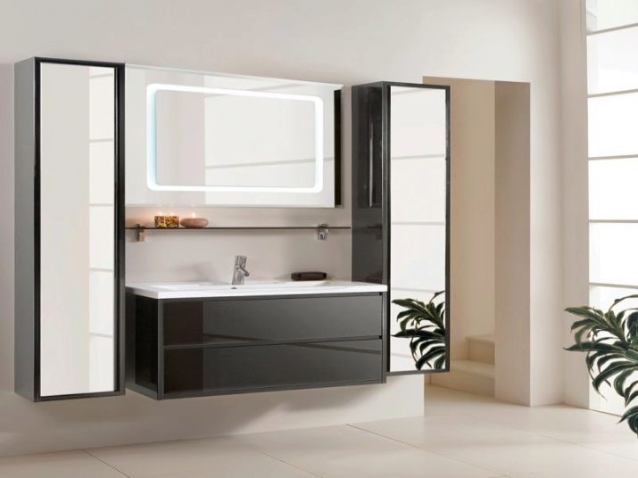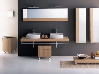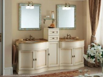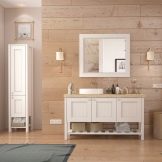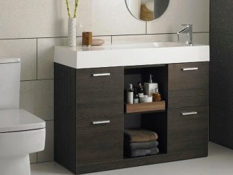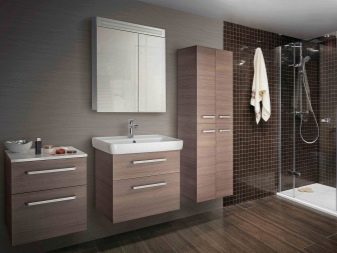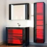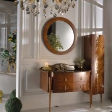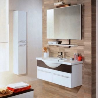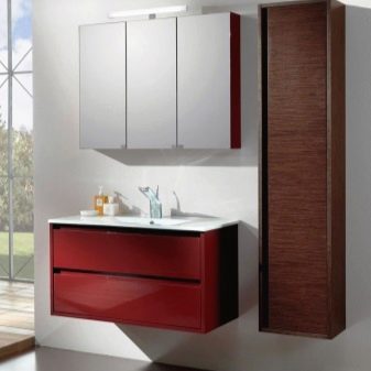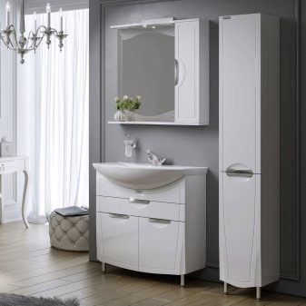 As a rule, a curbstone and a cabinet-mirror are acquired as a single set. In this case, the items have one material, style, color. So you get a harmoniously designed wash area. You can purchase such a cabinet and separately. The main thing is that its design is combined with other furniture in the room.