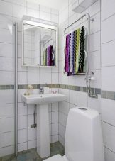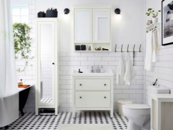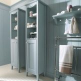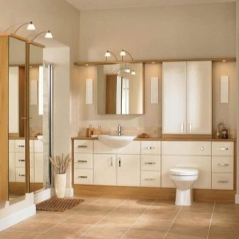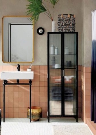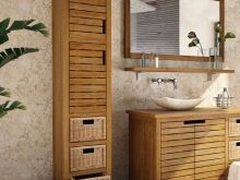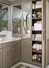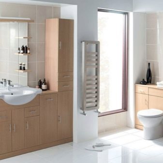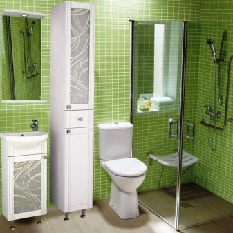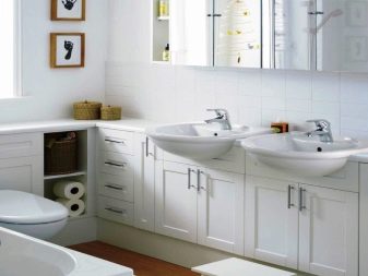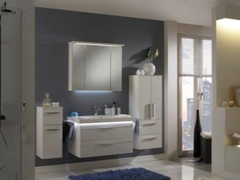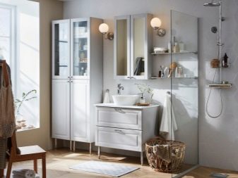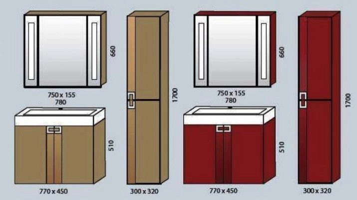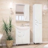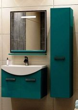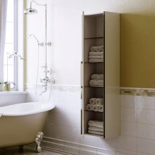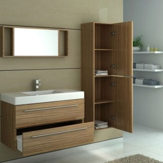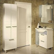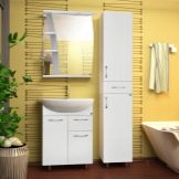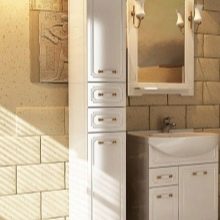 If there is not much space in the bathroom, you can limit yourself to moydodyr (a cupboard and a wall cabinet with a mirror). If you already have such a set, and you need an additional cabinet, think about where it will be placed. Its dimensions depend on this. For example, over an installation you can hang a product with a small height, but with a decent width. On a free area next to the washbasin you can place a narrow pencil case.