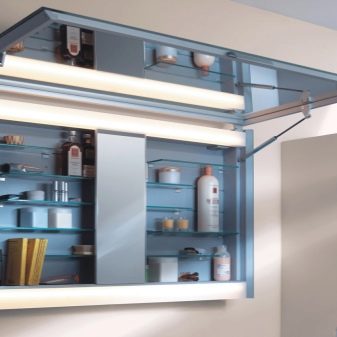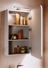 A wall cabinet with a mirror is often sold with a washbasin cabinet. The options are different. It can be a mirror with a shelf (or without it), to which a small closed cabinet is attached to the side. It can also be a small wall cabinet with a mirrored facade with shelves on the sides (or without them). The product can open in different ways. On sale there are models with swing and sliding doors.