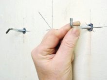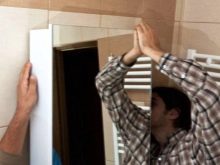First, markings are made on the wall. If “moidodyr” is installed, then the axis of the upper cabinet should correspond to the axis of the sink. Using a drill or hammer drill holes. It is important to remember: when drilling tile, the shock must be turned off, otherwise the material may crack or even crack. Dowels are inserted into the finished holes. Then the hooks on which the cabinet is hung are screwed.