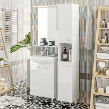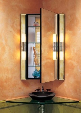 Inside the cabinet can be located shelves for large items (clean linen, towels, household chemicals). Glass shelves designed to place toothbrushes in glasses, cosmetics, razors and other light and small items.
