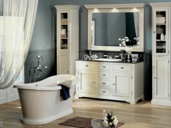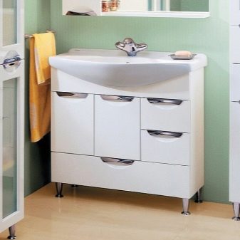 Among floor models products with legs are considered the best. They protect the bottom of the furniture from dampness, which is often observed in the bathroom on the floor. Hanging options in this sense are also good. In addition, they simplify cleaning and make the interior more modern, stylish and light.