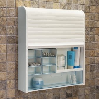 Hinged plastic cabinets are made of thicker and more durable material. Shampoos, shower gels, cleaning products, etc. can be stored in such a product.
