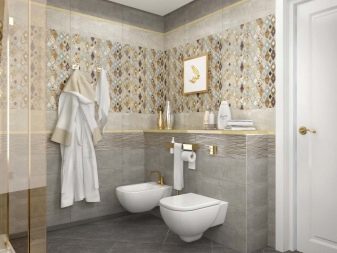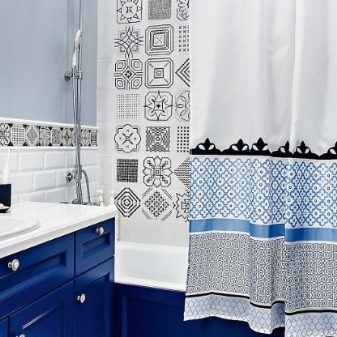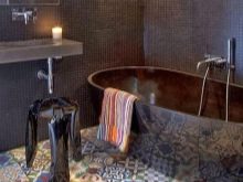 Besides, patchwork tiles harmoniously look in combination with vintage plumbing and heating appliances, furniture artificially aged or painted in bright colors. In the style of pop art, it can be complemented by bright accent prints resembling posters. Thick stone countertops made of limestone, wicker baskets, soft poufs with ethnic ornaments look good in such a frame. Graphite gray tiles emphasize the conciseness of high-tech details: chrome paper holders, heated towel rails. In this embodiment, the area of the bath and the bathroom is finished, and the floor remains plain.