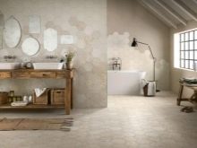 - Patchwork style tiles in a modern loft style bathroom. Rough brick walls and snow-white furniture look very impressive in combination with a mosaic floor lined with large-format hexagonal modules.