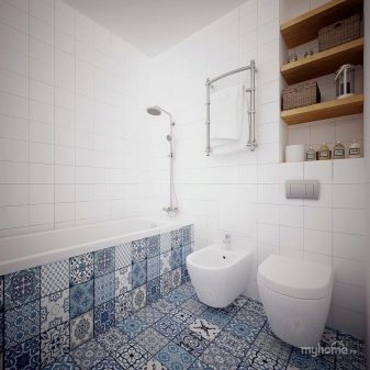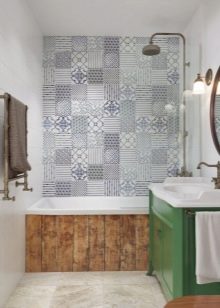 - Provence. Delicate, naive floral motifs, gray-blue tones - this is what a patchwork looks like in a bathroom in a typical French province. You can tile the bath screen or floor.
