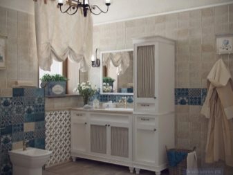 It is not enough to choose a beautiful patchwork tile for the bathroom. You also need to choose the right frame for her. So that the ornament in the spirit of patchwork is not dissonant with the overall design, it is worth paying attention to the decor and furnishings placed in the interior. Even the right textiles - small flower curtains or lace curtains, homespun rugs on the floor, unbleached towels - can be a good addition to this unusual design option.