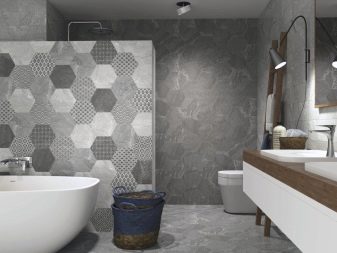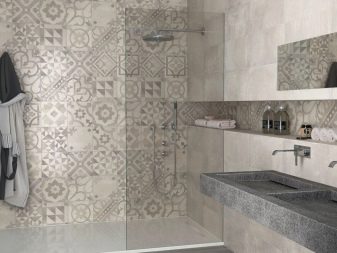 Among the design options for the bathroom in the patchwork style, there are two main areas. Achromatic decoration involves the use of only 3 basic colors in the ornaments: white, gray, black. In such a combination, an octagonal or hexagonal tile looks interesting, forming a unique mosaic coating.