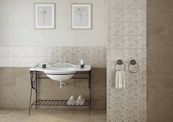 The largest large-sized modules 45 × 45 or 25 × 50 are most often used in flooring in spacious bathrooms, can be used indoors with a pool or font. It is better to avoid variegation, preferring monochrome colors. The wall decorated with tiles, turning into a floor finish, looks interesting - the choice of rectangular modules will help to add height to the room.