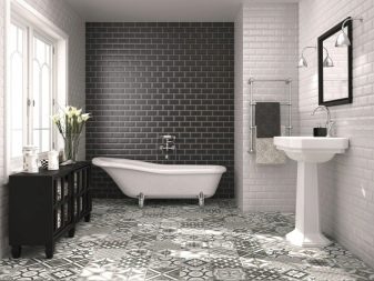 Black and white combination will be a winning solution for bathtubs, where brick trim will prevail.Thanks to the glossy surfaces, it will be possible to create a pleasant atmosphere in the room, conducive to a pleasant and relaxing pastime.