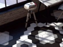 High strength, fire resistance, moisture resistance, and durability stand out from the advantages of the finishing material. The main minus of hexagons – high cost and complexity of design work due to the non-standard form.