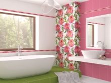 - Green. The spectacular combination of emerald and pink will fill the room with bright, rich colors. Raspberry ceramic tiles go well with green furniture and emerald-colored towels.