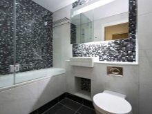To make the room brighter, “shine”, use white plumbing, glass elements (especially small mirrors). Furniture is also advised to use white tones. But, in addition to color combinations, you can use gray tiles with variations in texture and dimensions. The bathroom looks very attractive, part of the walls of which are covered with large tiles, and the other part - with mosaics.