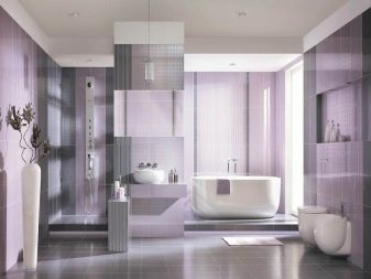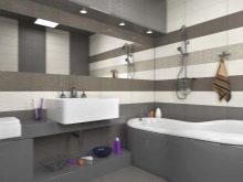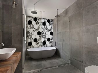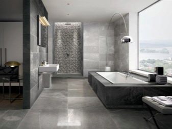 Full cladding of the entire wall is not recommended. It would be more correct to create a vertical strip, letting it go in the center of the wall. But on the floor, large ceramic tiles are contraindicated, since there they will have to be cut. In a rectangular bathroom, it is advised to use tiles of 0.2x0.3 m, in a square - 0.2x0.2 m. To make gray tile more interesting, you can diversify it by using the following solutions: