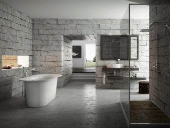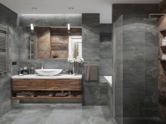 Gray is a physical color and not a color at all. In the design tradition, it is referred to as achromatic colors. The lack of coloristic load fully meets the canons of minimalistic design. In a bathroom of a minimalist format, the use of tiles that differ in texture, geometric configuration and size is allowed. The most popular are large tiles and "wild boar".