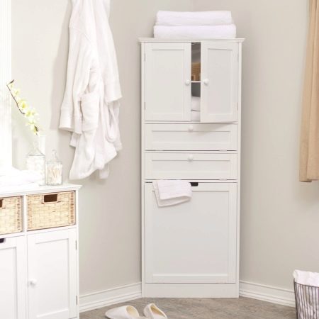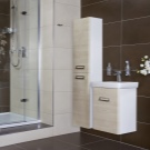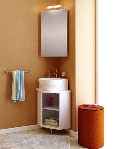 Any kind of structures made taking into account the specifics of a given place can occupy an angle. It can be floor or hanging cabinets. For spacious bathrooms design corner headsets with a large number of different cabinets. But in most cases, corner furniture helps the owners of small rooms when the corner in the room is the only free place. We offer you to view photos with this kind of furniture in the interior of the bathroom.