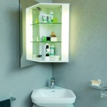 - For small rooms, there are compact sets of cabinets that complement the corner sink. A glass door and lights adorn simple designs.