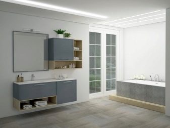 These types of structures are located directly on the floor. To place them, the room must have certain dimensions. Outdoor furniture is mounted on legs, casters or plinth. In the latter case, no gap is visible between the bottom and the floor, and it looks as if it was placed directly on the floor. This option is not too good for wet rooms, but nevertheless it is used.
