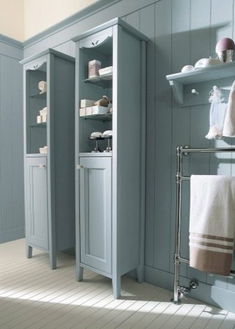 - Floor cabinets in the form of combined pencil cases allow you to use the availability of open shelves and make it possible to hide unsightly things behind a closed door. The one-sided design of high panels and furniture in the bathroom beautifully builds the interior in the style of shabby chic.