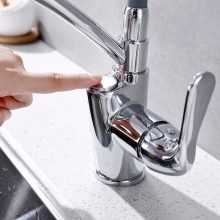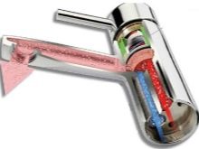 There are also touch buttons. A simple touch to them, even without pressing, activates the mixer. The appearance of such a device makes it acceptable in the futuristic interior. Buttons can be located both on the mixer body, and at the spout, and on a separate panel. If the device is equipped with a thermostat, it is logical to use a liquid crystal screen with a display of the pressure force and the degree of heating of the water.
